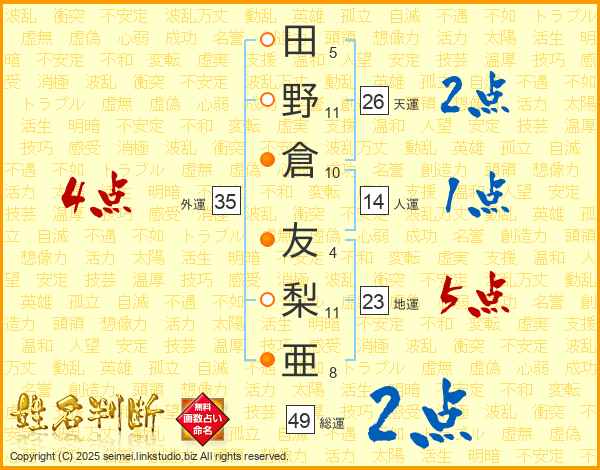 生活面を象徴する運勢です。外部から受ける影響力を表し、結婚運、家庭運や職場、環境への順応性を表します。総運から人運を引いた画数。姓や名が1文字の場合を除く。