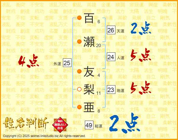 百(6画)瀬(20画) 友(4画)梨(11画)亜(8画)