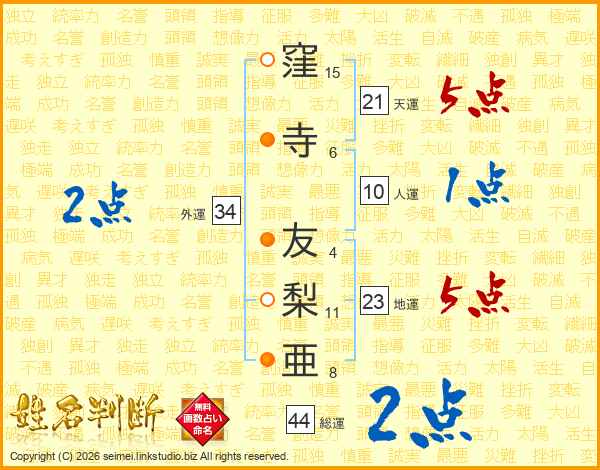 窪(15画)寺(6画) 友(4画)梨(11画)亜(8画)