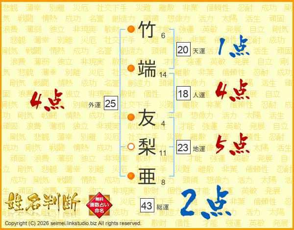 竹(6画)端(14画) 友(4画)梨(11画)亜(8画)