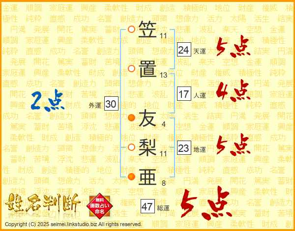 笠(11画)置(13画) 友(4画)梨(11画)亜(8画)