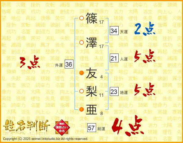 篠(17画)澤(17画) 友(4画)梨(11画)亜(8画)