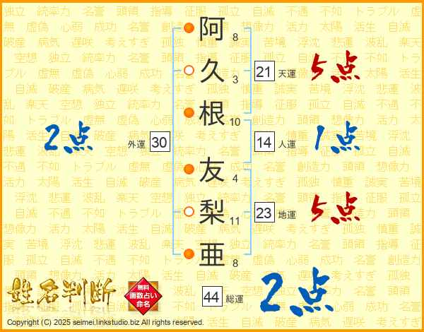 阿(8画)久(3画)根(10画) 友(4画)梨(11画)亜(8画)