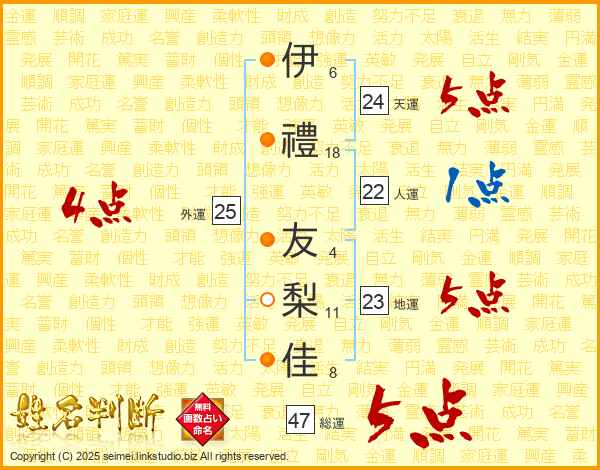 伊(6画)禮(18画) 友(4画)梨(11画)佳(8画)