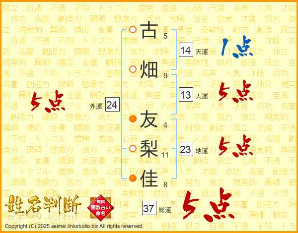 古(5画)畑(9画) 友(4画)梨(11画)佳(8画)