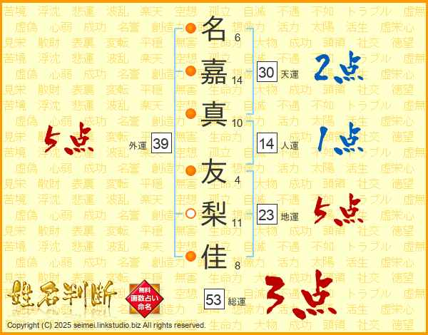 名(6画)嘉(14画)真(10画) 友(4画)梨(11画)佳(8画)