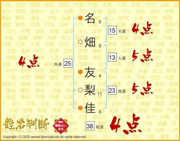 名(6画)畑(9画) 友(4画)梨(11画)佳(8画)