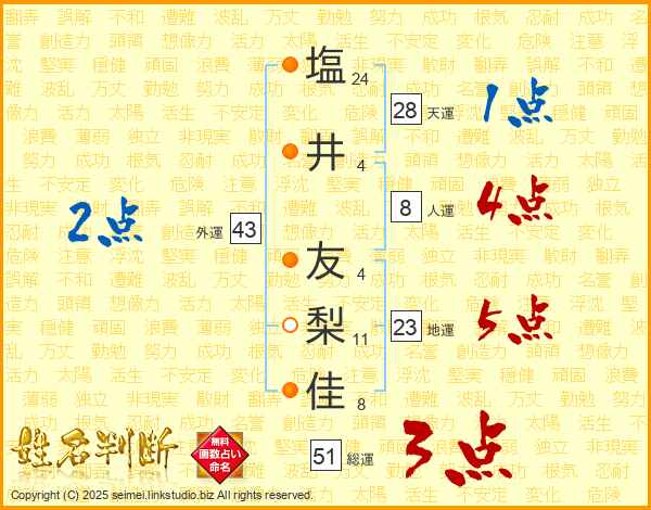 塩(24画)井(4画) 友(4画)梨(11画)佳(8画)