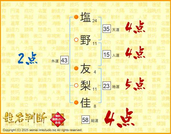 塩(24画)野(11画) 友(4画)梨(11画)佳(8画)