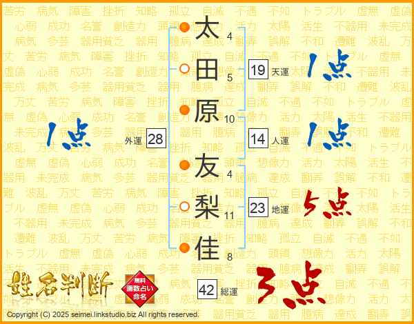 太(4画)田(5画)原(10画) 友(4画)梨(11画)佳(8画)
