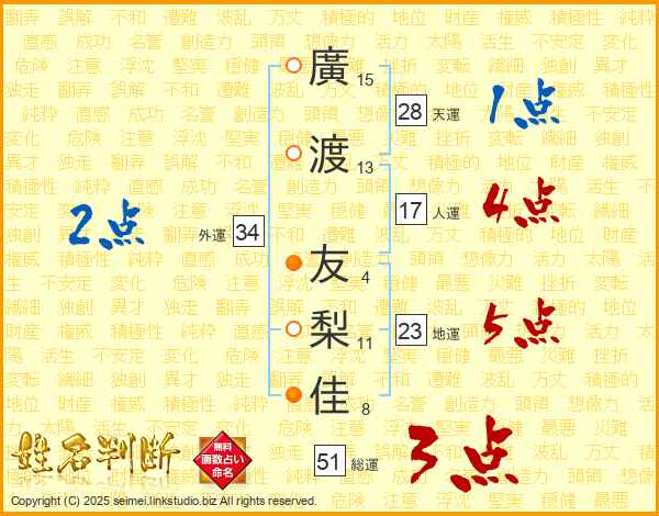 廣(15画)渡(13画) 友(4画)梨(11画)佳(8画)