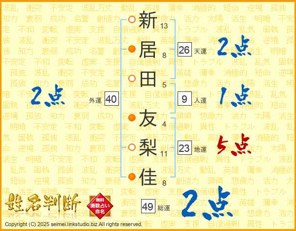 新(13画)居(8画)田(5画) 友(4画)梨(11画)佳(8画)