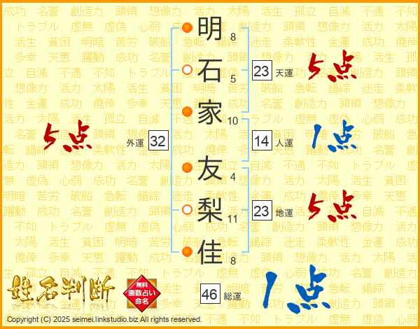 明(8画)石(5画)家(10画) 友(4画)梨(11画)佳(8画)