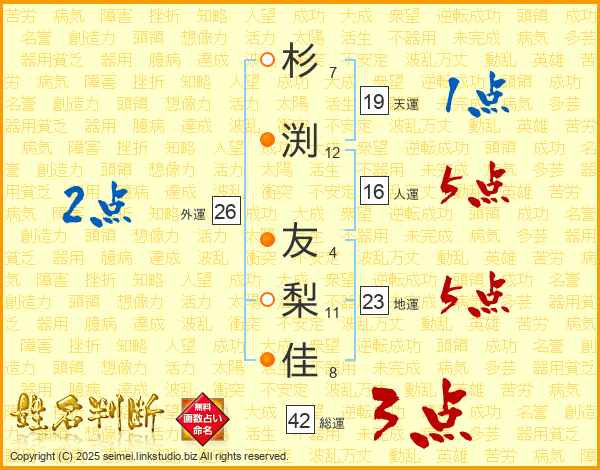 杉(7画)渕(12画) 友(4画)梨(11画)佳(8画)