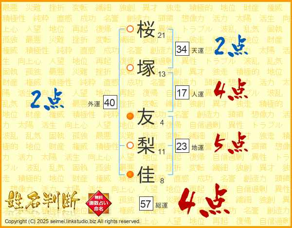 桜(21画)塚(13画) 友(4画)梨(11画)佳(8画)