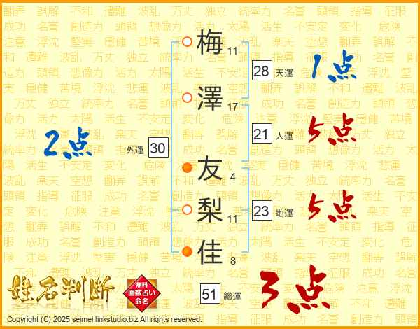 梅(11画)澤(17画) 友(4画)梨(11画)佳(8画)