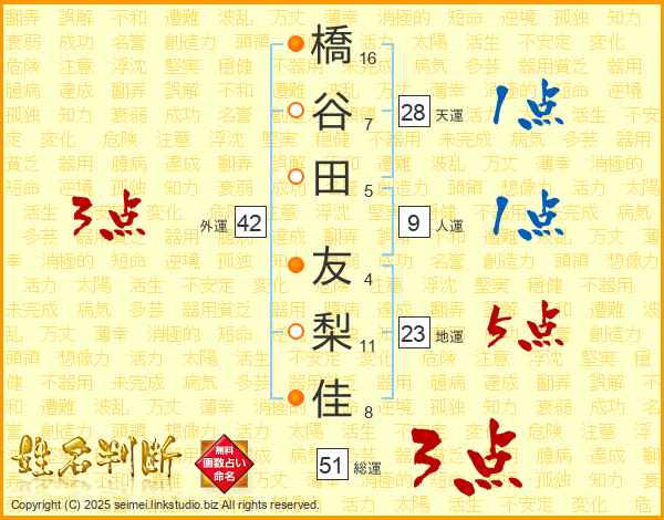 橋(16画)谷(7画)田(5画) 友(4画)梨(11画)佳(8画)