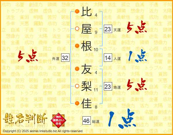 比(4画)屋(9画)根(10画) 友(4画)梨(11画)佳(8画)