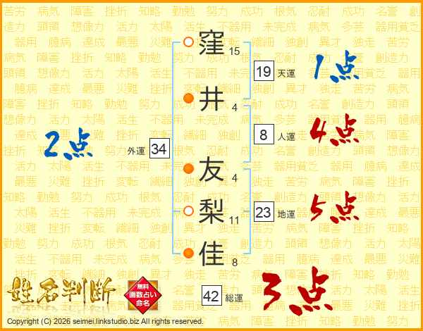 窪(15画)井(4画) 友(4画)梨(11画)佳(8画)