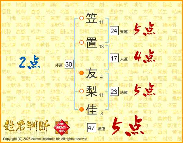 笠(11画)置(13画) 友(4画)梨(11画)佳(8画)