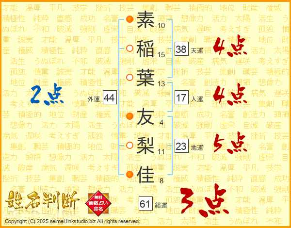 素(10画)稲(15画)葉(13画) 友(4画)梨(11画)佳(8画)