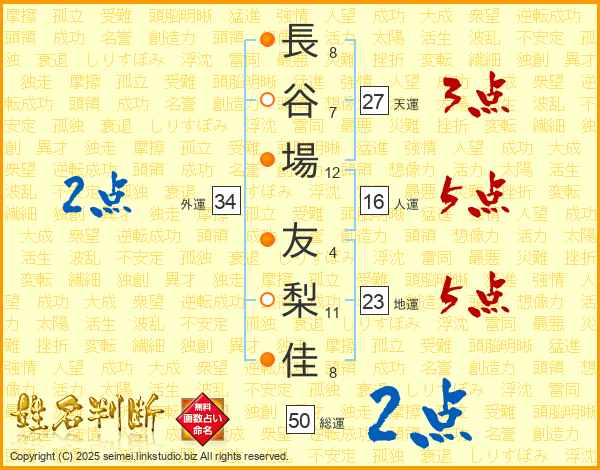 長(8画)谷(7画)場(12画) 友(4画)梨(11画)佳(8画)