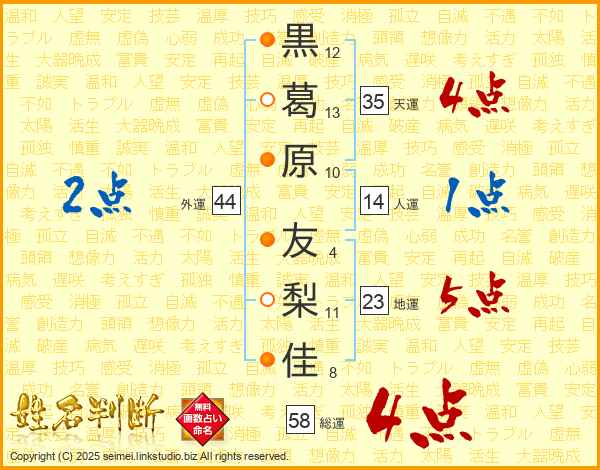黒(12画)葛(13画)原(10画) 友(4画)梨(11画)佳(8画)