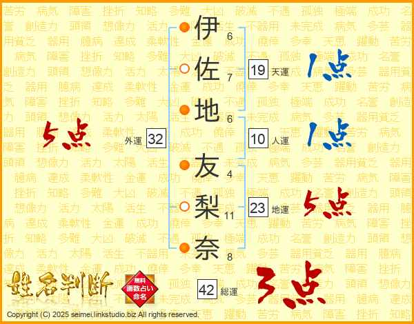 伊(6画)佐(7画)地(6画) 友(4画)梨(11画)奈(8画)