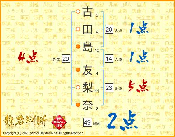 古(5画)田(5画)島(10画) 友(4画)梨(11画)奈(8画)
