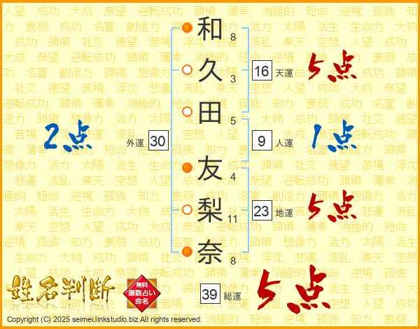 和(8画)久(3画)田(5画) 友(4画)梨(11画)奈(8画)