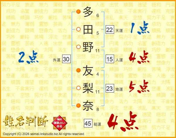 多(6画)田(5画)野(11画) 友(4画)梨(11画)奈(8画)
