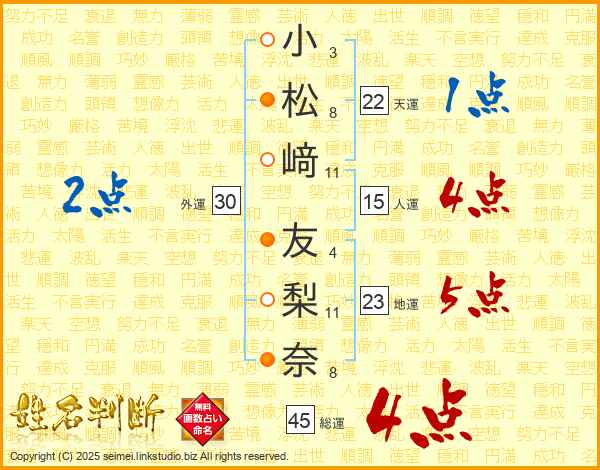 小(3画)松(8画)﨑(11画) 友(4画)梨(11画)奈(8画)