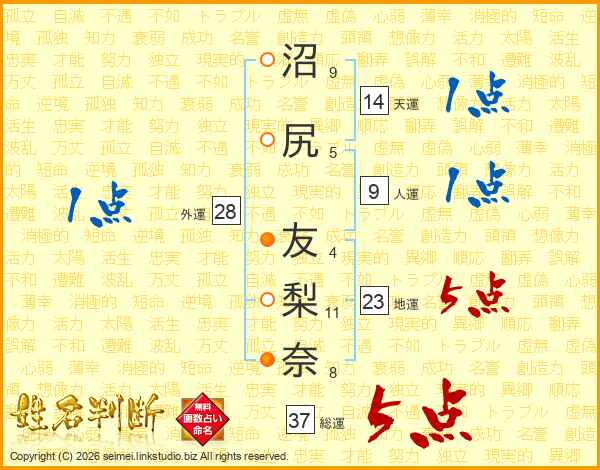 沼(9画)尻(5画) 友(4画)梨(11画)奈(8画)