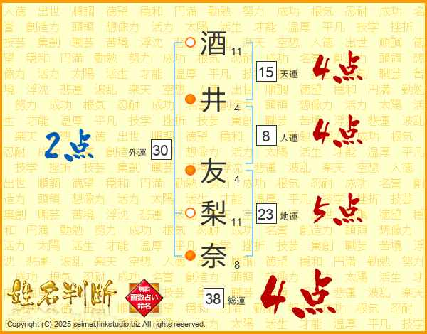 酒(11画)井(4画) 友(4画)梨(11画)奈(8画)