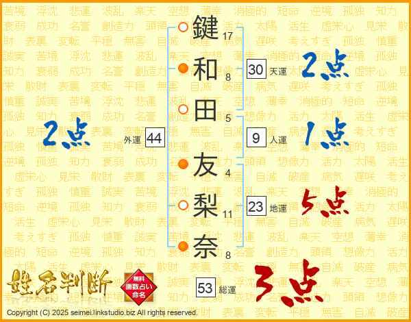 鍵(17画)和(8画)田(5画) 友(4画)梨(11画)奈(8画)