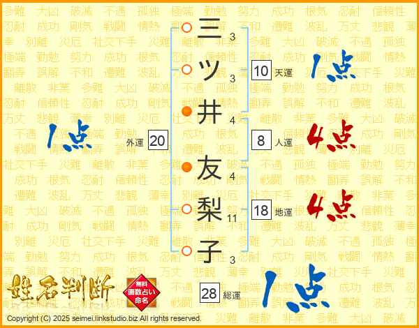 三(3画)ツ(3画)井(4画) 友(4画)梨(11画)子(3画)