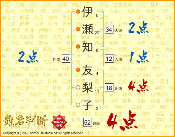 伊(6画)瀬(20画)知(8画) 友(4画)梨(11画)子(3画)