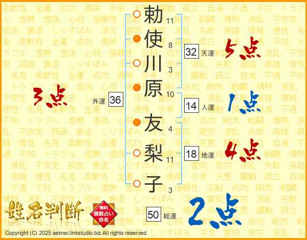 生活面を象徴する運勢です。外部から受ける影響力を表し、結婚運、家庭運や職場、環境への順応性を表します。総運から人運を引いた画数。姓や名が1文字の場合を除く。
