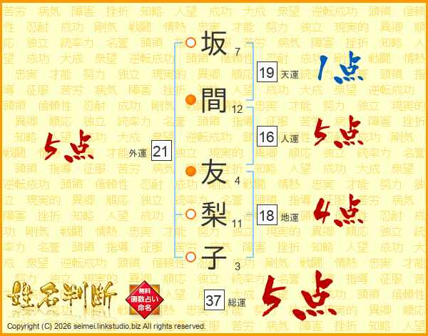 坂間友梨子さんの総運は37画の5点!