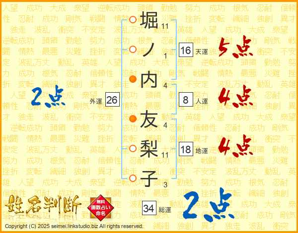 堀(11画)ノ(1画)内(4画) 友(4画)梨(11画)子(3画)
