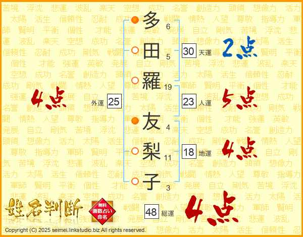 多(6画)田(5画)羅(19画) 友(4画)梨(11画)子(3画)