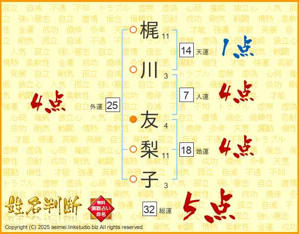 梶川友梨子さんの総運は32画の5点!