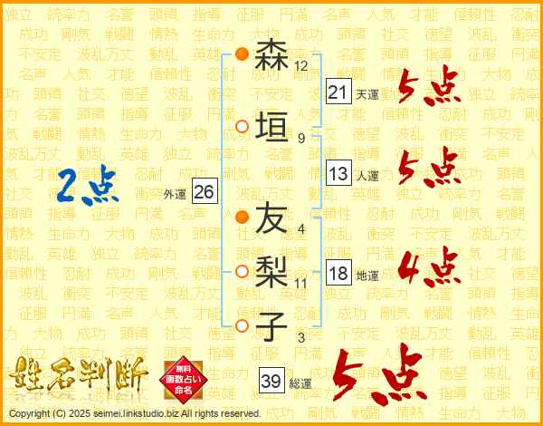 森(12画)垣(9画) 友(4画)梨(11画)子(3画)