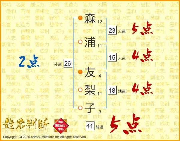 森(12画)浦(11画) 友(4画)梨(11画)子(3画)