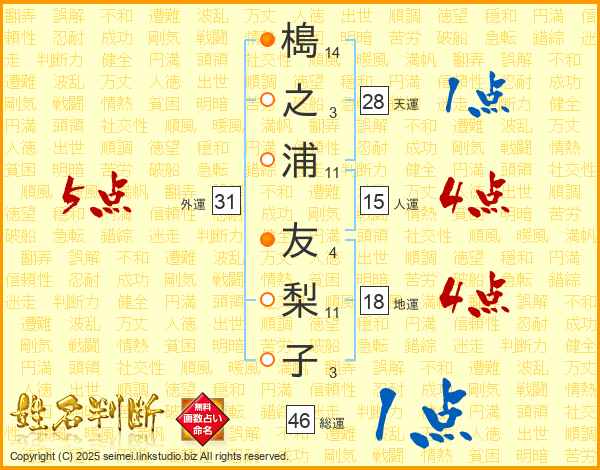 槝(14画)之(3画)浦(11画) 友(4画)梨(11画)子(3画)