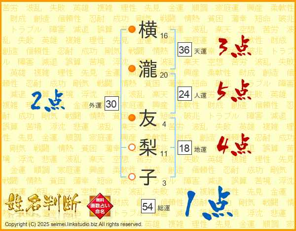 横(16画)瀧(20画) 友(4画)梨(11画)子(3画)
