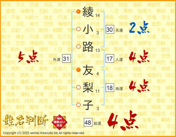 綾(14画)小(3画)路(13画) 友(4画)梨(11画)子(3画)