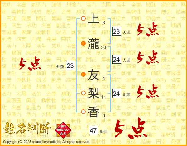 上(3画)瀧(20画) 友(4画)梨(11画)香(9画)