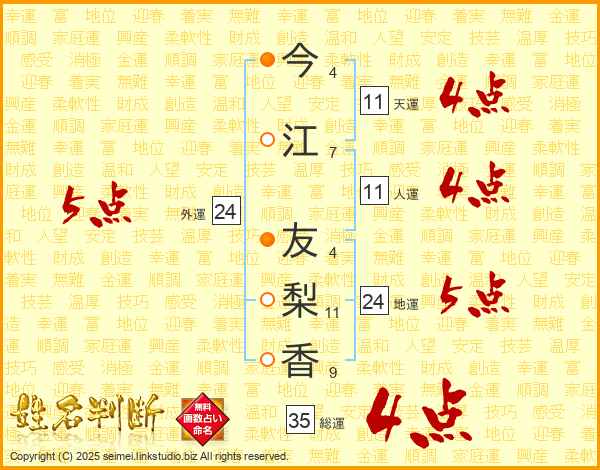 今(4画)江(7画) 友(4画)梨(11画)香(9画)