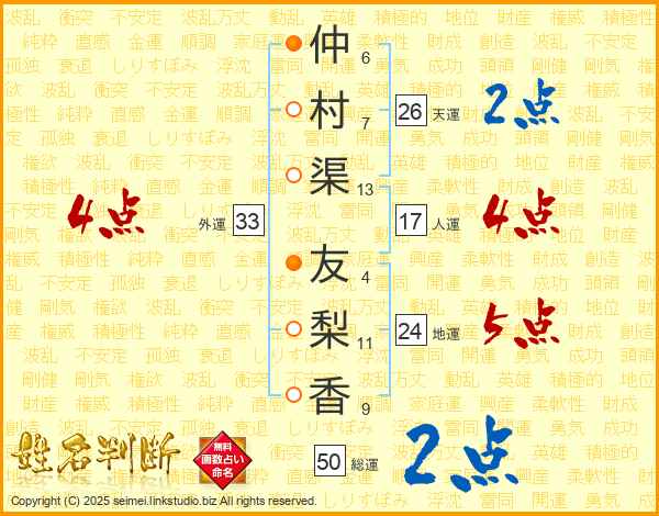 仲(6画)村(7画)渠(13画) 友(4画)梨(11画)香(9画)